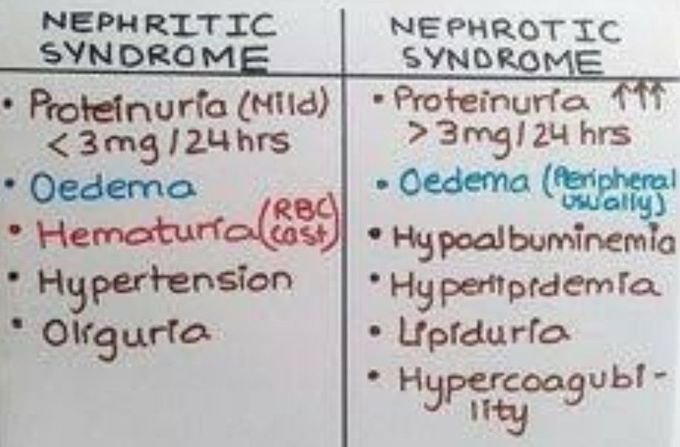 Nephrotic syndrome is a condition involving the loss of significant volumes of protein via the kidneys proteinuria which results in hypoalbuminaemia. Good resource for practicing nephrotic vs. If you really want to pare it down if you only have enough brain space to remember one feature for each disorder remember that nephrotic syndrome is characterized by massive proteinuria the o in nephrotic and nephritic syndrome is characterized by inflammation the -itic in nephritic.