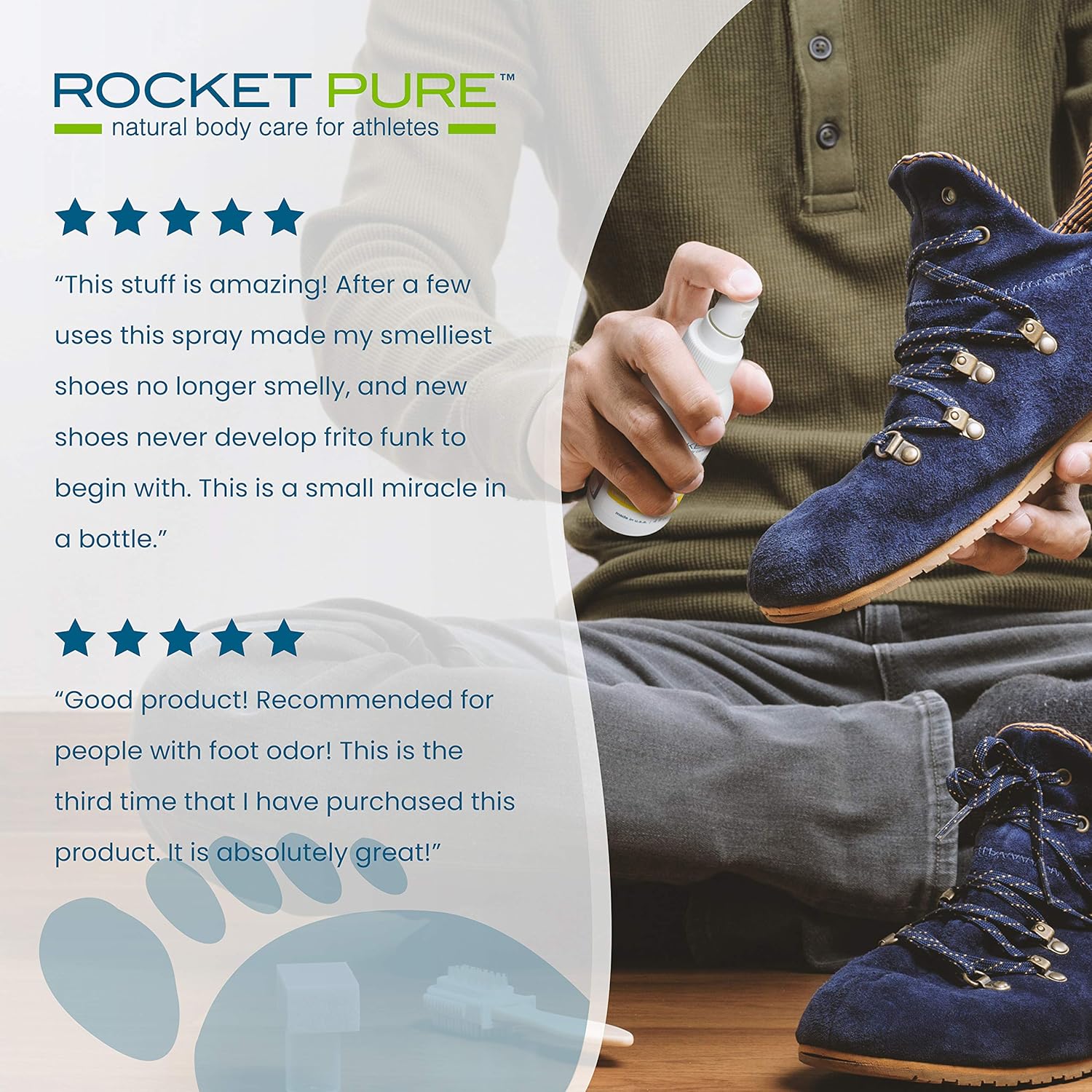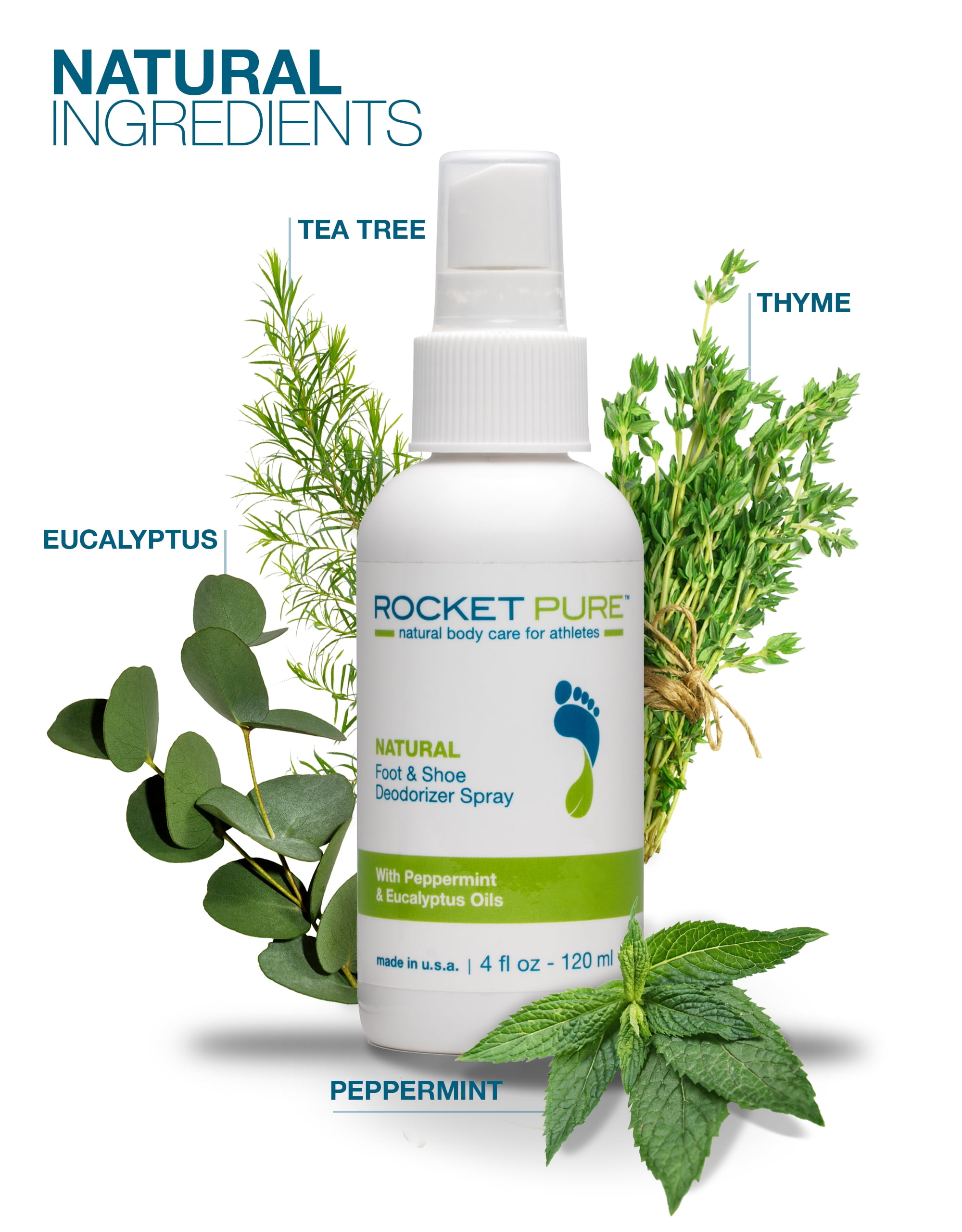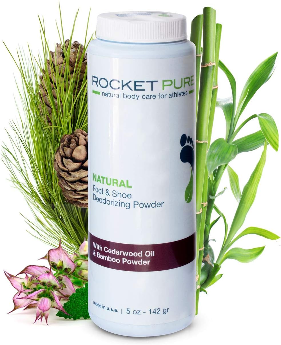 Rocket Pure makes natural body care for athletes including foot and shoe deodorizer sprays and powders as well as anti-chafe balms and hand and foot balms and zinc sunscreens. Best Natural Shoe Deodorizer. Spray directly on your feet rub it thoroughly into your skin.