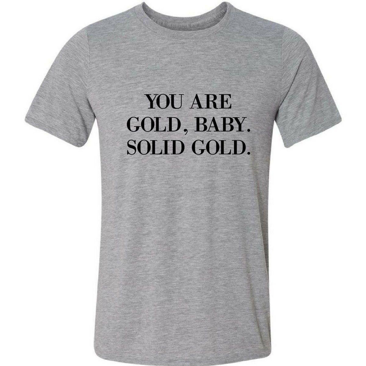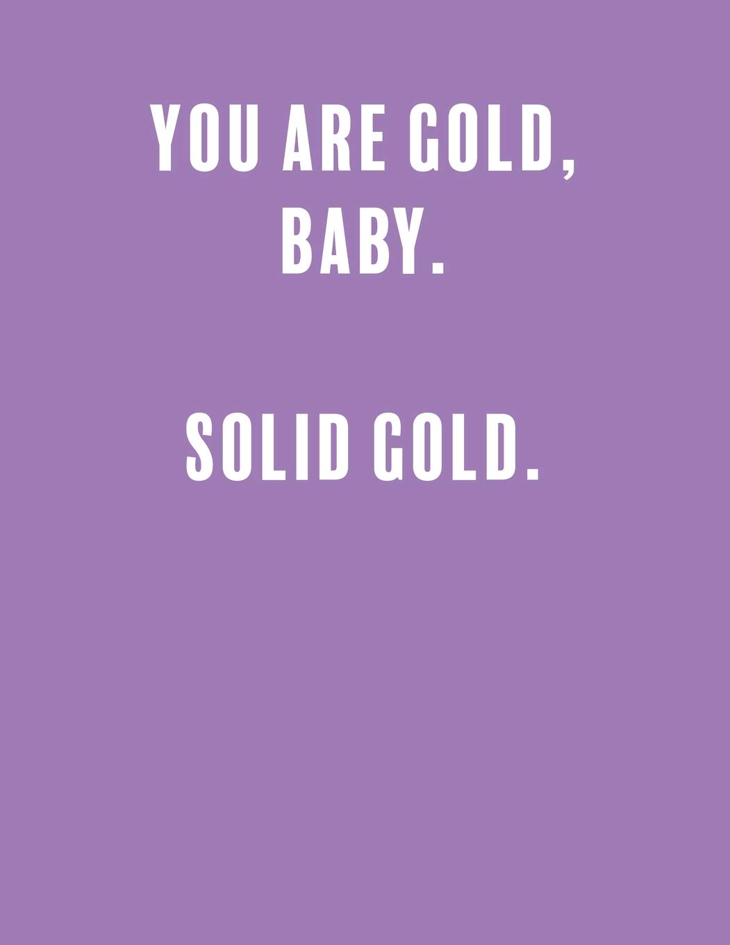 Solid gold Its hard to find a good slogan t-shirt thats catchy but doesnt make you cringe. Hand-embellished greeting cards and art prints designed by Kay Gamby finished with colorful neon paints and glitter detail. Greeting cards use a unique textured paper hand-painted with neons and glitter paired with a white envelope. A5 to A3 prints are professionally printed onto the finest quality 300 gsm matte stock and will arrive cellophane wrapped with a protective card. Designed in the UK. You are gold baby. You are Gold baby.