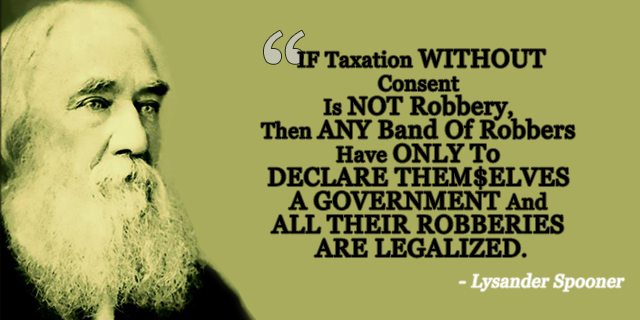 If taxation without consent is not robbery then any band of robbers have only to declare themselves a government and all their robberies are legalized -- Lysander Spooner.